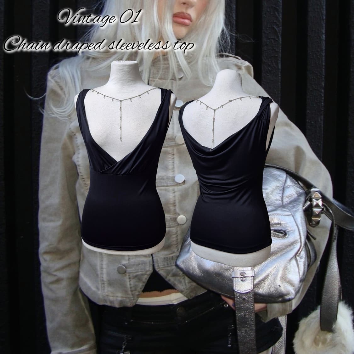 Vintage 01 Chain draped sleeveless top(Black) in A condition 총장 51 가슴 43 블랙 드레이프 체인 슬리브리스 탑 딥 넥라인, 깔끔한 컨디션 ꦿ᭄구매는 채팅으로 문의주세요