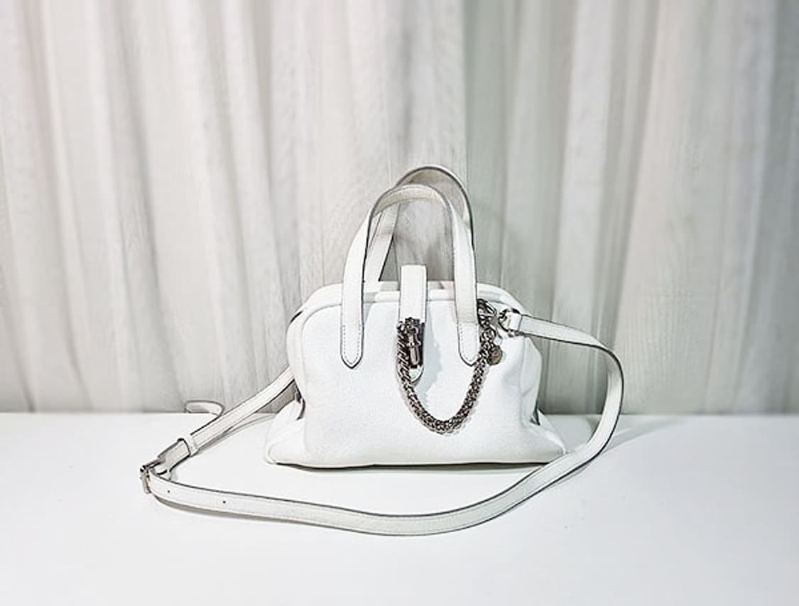 사이즈 25 x 15 x 10 분크 화이트컬러 토크백 스몰사이즈 별도 구매한 참장식 포함입니다. 모서리 흐릿한 얼룩과 안감 얼룩외 자연스러운 중고감정도 양호합니다.