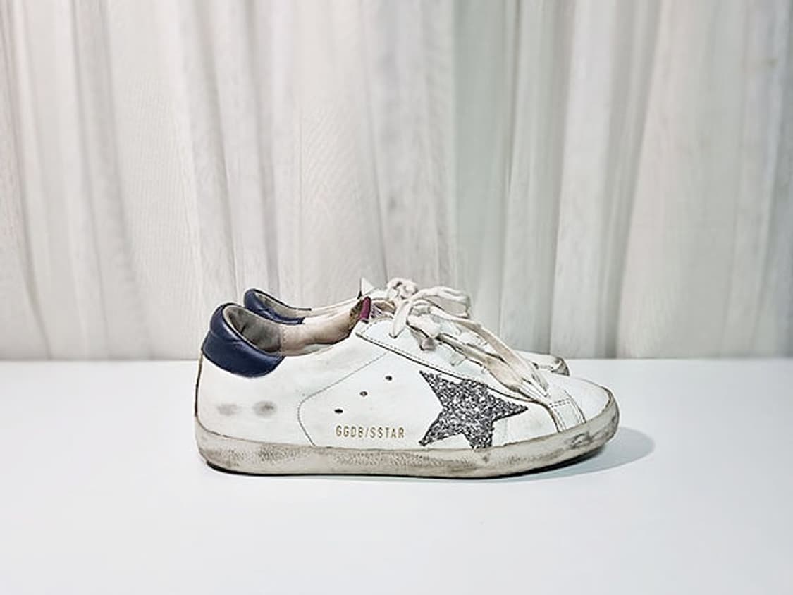 표기 37 권장 235 굽 속굽포함 4센치 골든구스 슈퍼스타 스니커즈 글리터 별 패치 화이트.뒤쪽은 네이비 발바닥과 닿는 부분 때탐외 자연스러운 중고감정도 양호합니다.