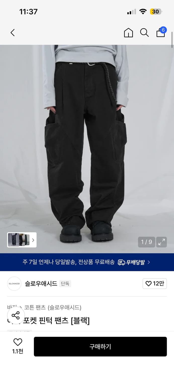 [새상품] 슬로우애시드 아웃심 커브드 코튼 팬츠 블랙 M