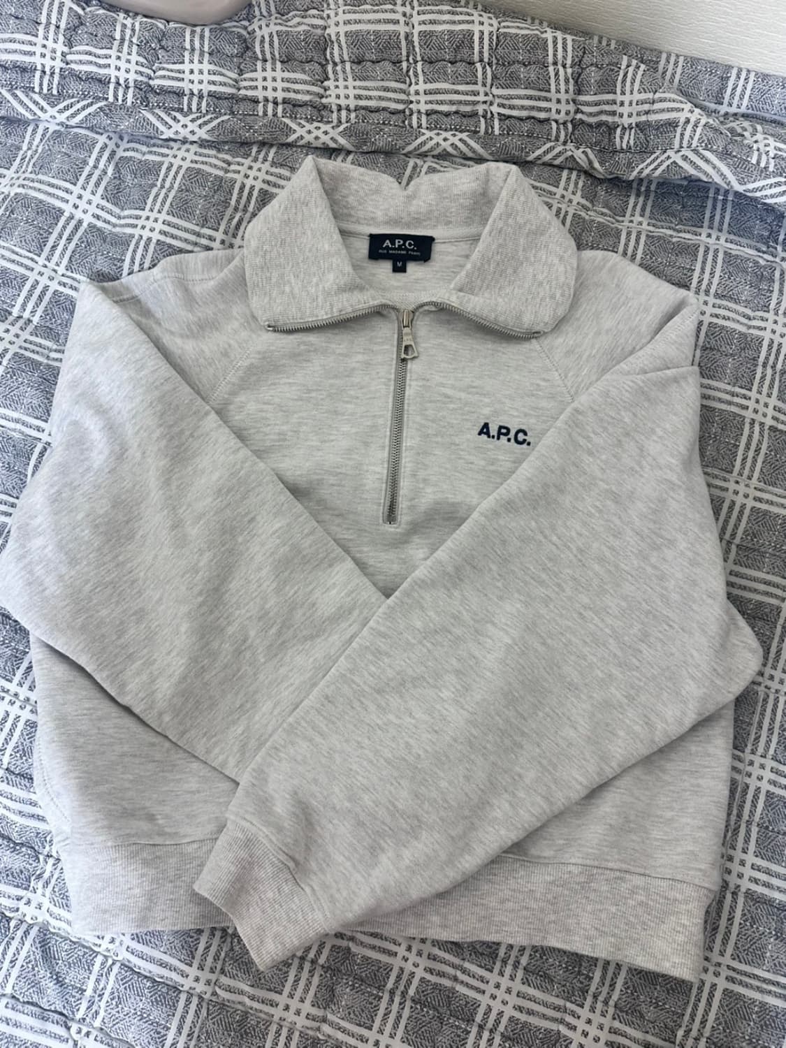 A.P.C. 그레이 색상 반집업 맨투맨입니다. 3번정도 착용하고 어울리지 않아 처박템이 되어 판매합 니다.