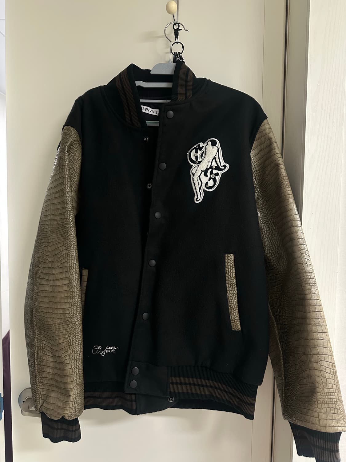 604service 바시티자켓 1사이즈입니다. *사이즈 2가지로 작은 사이즈입니다.* 저한테는 커서 실착 1회만 했습니다. 디테일이 워낙 예뻐서 품고 있다가.. 이제는 보내주려고 합니다. 팔 레더 소재 특성상 크랙에 까짐이 아주 조금 있지만 실착 1회로 나머지 부분 매우 깨끗합니다. 상태 최상 + 안에 누빔까지 있고요 + 희소성 있는 제품입니다..!