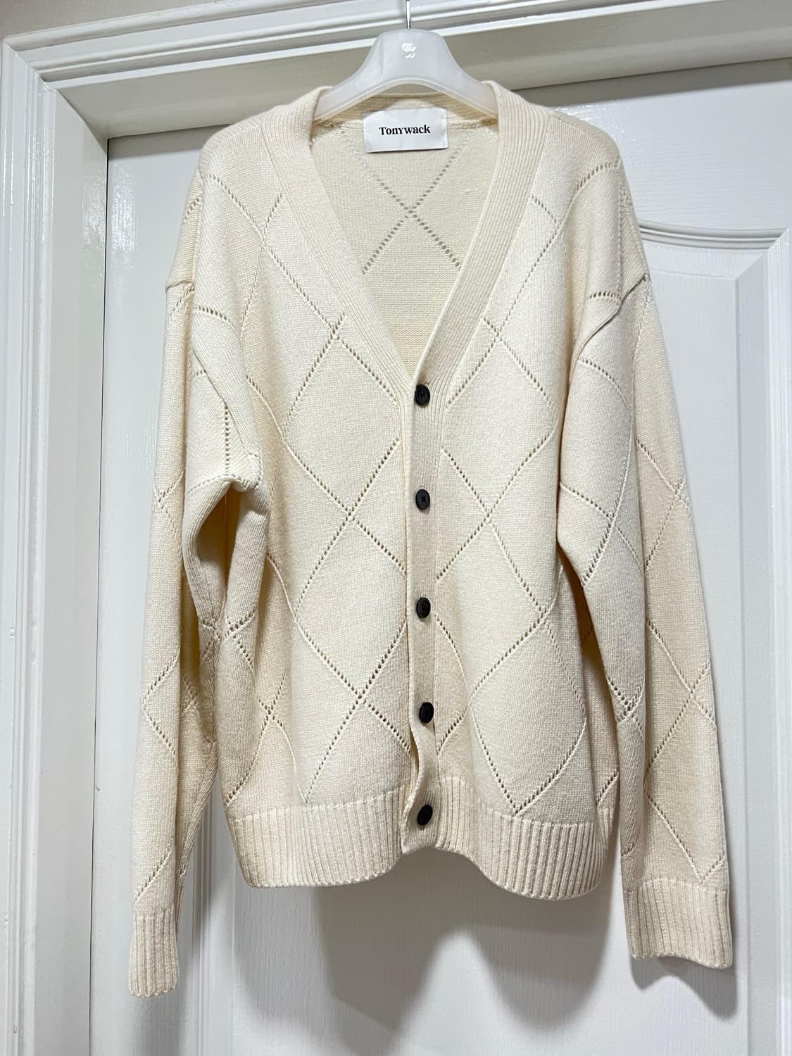 토니웩 아이보리 컬러 아가일 패턴 가디건입니다. 울이 들어가 부드러운 소재로 편안하게 착용 가능합니다. 사이즈는 L이라 100~105 입으시는 분께 적당히 여유있게 잘 맞습니다. 드라이클리닝까지 마쳐서 옷 상태는 매우 좋습니다.