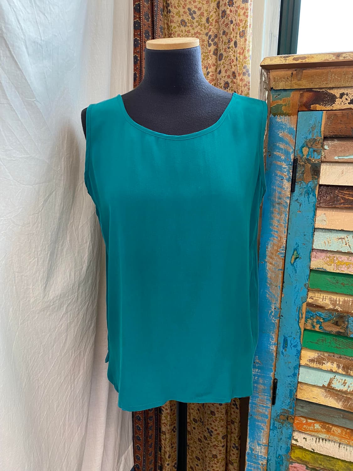 밝은 청록빛이 매력적인 슬리브리스탑입니다. 실크 100% 택사이즈 M 실측사이즈 어깨 36.5 가슴 48.5 암홀길이 21.5 밑단단면 49 총장/어깨라인기준 60.5