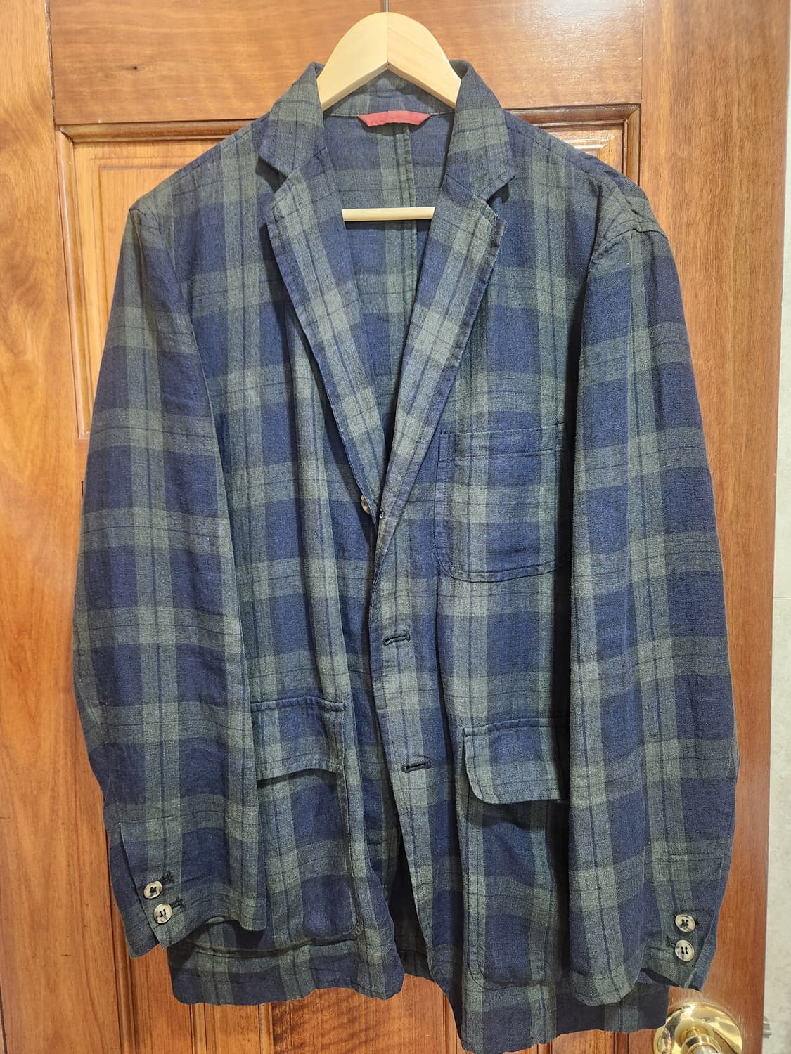 아메리칸 클래식 컨셉의 프랑스 브랜드 jkeyge 린넨 체크 블레이저 린넨 특성상 보관상 구김 있으나 원단 늘어짐. 보플 없이 전체적으로 상태 좋습니다.