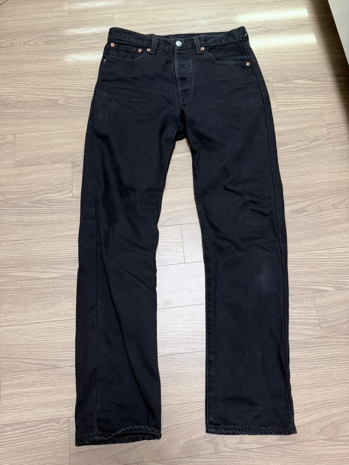 사용감 어느정도 있어요 슬림한 핏 굉장히 이쁩니다 블랙진이라 시크한 느낌도 있고요 허리 38.5 허벅지 단면 27 총장 101 밑단 17 실측 직접 측정하여 1~2cm 오차 있을 수 있습니다