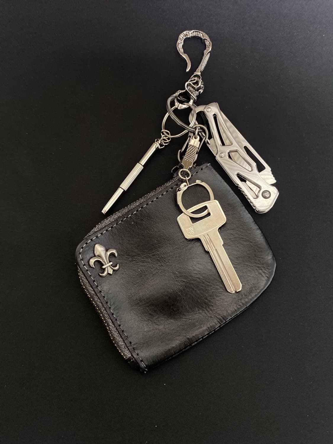 U후크 ㆍ블랙 빈티지 동전 지갑ㆍ휴대용 나이프ㆍ안경드라이버ㆍ블랭크키 구성입니다. 은은한 광택의 블랙 가죽과 메탈 장식이 어우러진 키 파우치 세트입니다.(유연한 타입이 아닌, 형태감이 살아있는 하드 타입 가죽입니다. 싸이즈 가로10cmx세로 8cm)