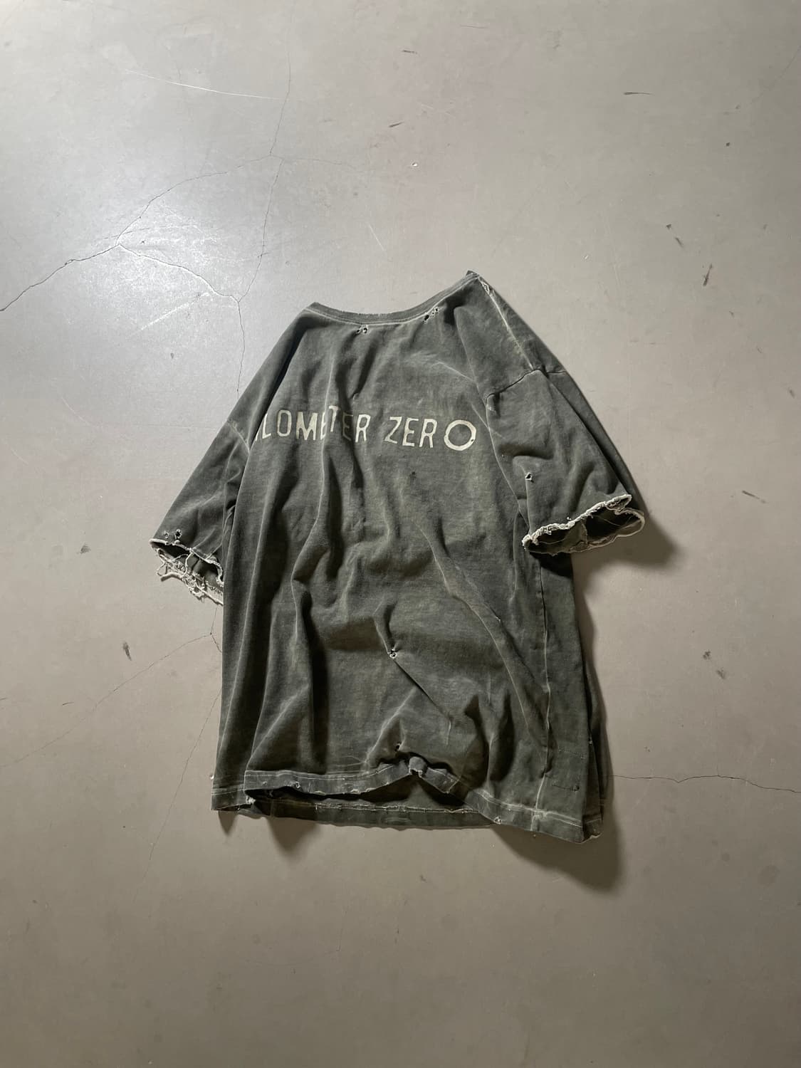 Product Info • Brand : KZ Atelier • Item : Distressed T-shirt • Color : Washed Khaki • Size : OS • Measurements : 가슴 61cm / 총장 72cm • Fabric : Cotton • Condition : 디스트로이드 및 워싱 디테일이 제품 ⸻ Description KZ 아틀리에 제작 티셔츠입니다. 강한 워싱감과 자연스러운 데미지 디테일, Kilometer Zero 프린트가 더해진 무드 있는 피스입니다.루즈한 실루엣으로 단독 착용만으로도 스타일링이 완성됩니다.