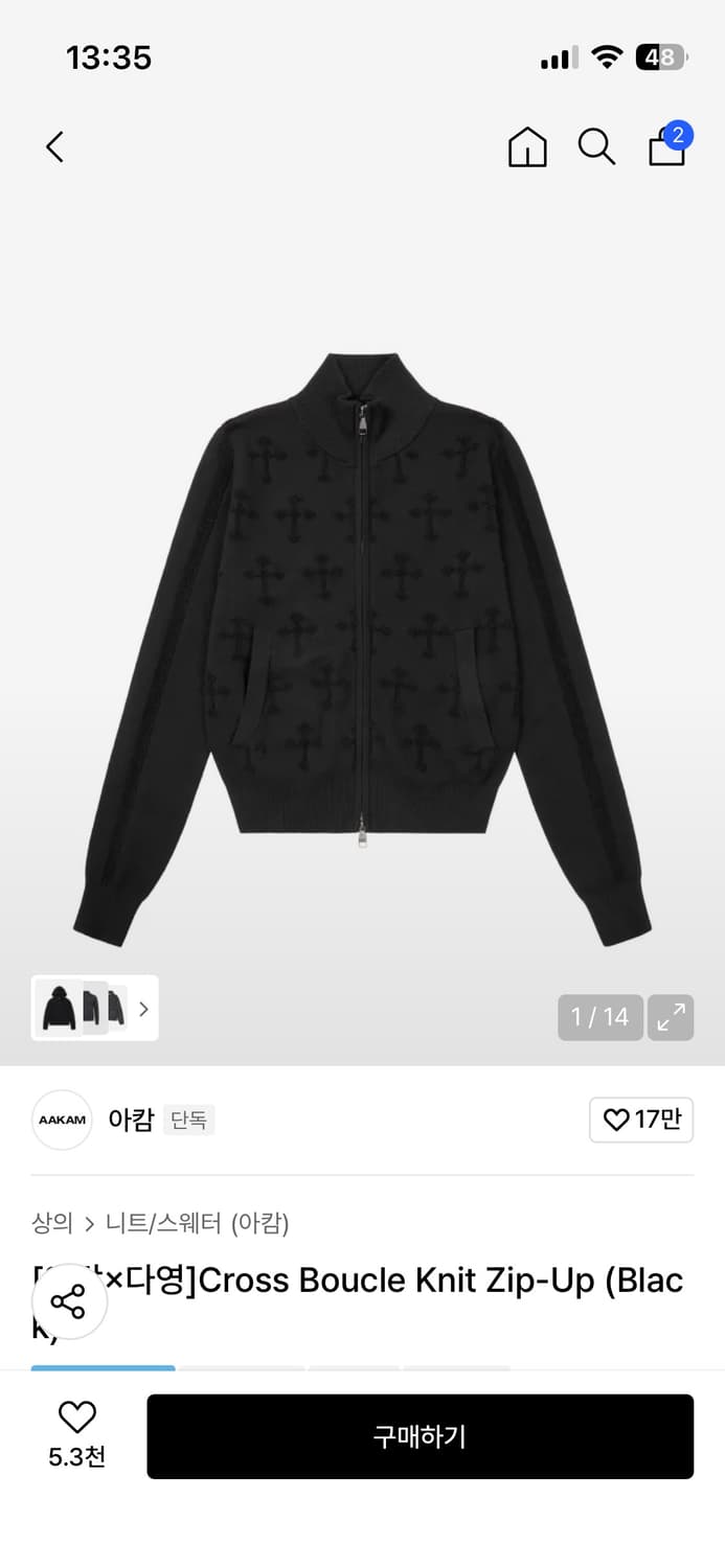 아캄 Cross Boucle Knit Zip-Up (BLACK) 사이즈 : 1 상세사이즈 참고해주세요 두번 착용했는데 이제 스타일 바꾸려고 판매합니다