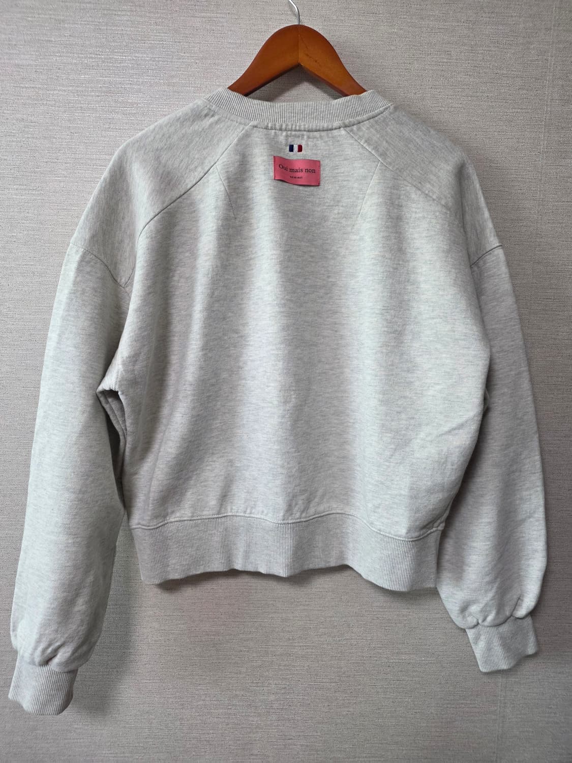 색상 : 멜란지 그레이 프리사이즈 가슴단면 61 / 총장 56 상태좋음 뒷면 상단에 프랑스 국기 컬러 자수 디테일과 “Oui mais non” 핑크 라벨이 포인트. 어깨선이 자연스럽게 떨어지는 레글런 소매에 아방한 핏으로 편하게 착용 가능. 뒷모습 포인트 예쁘다는 후기 많습니다. 택포 중고거래 특성상 교환/환불 불가