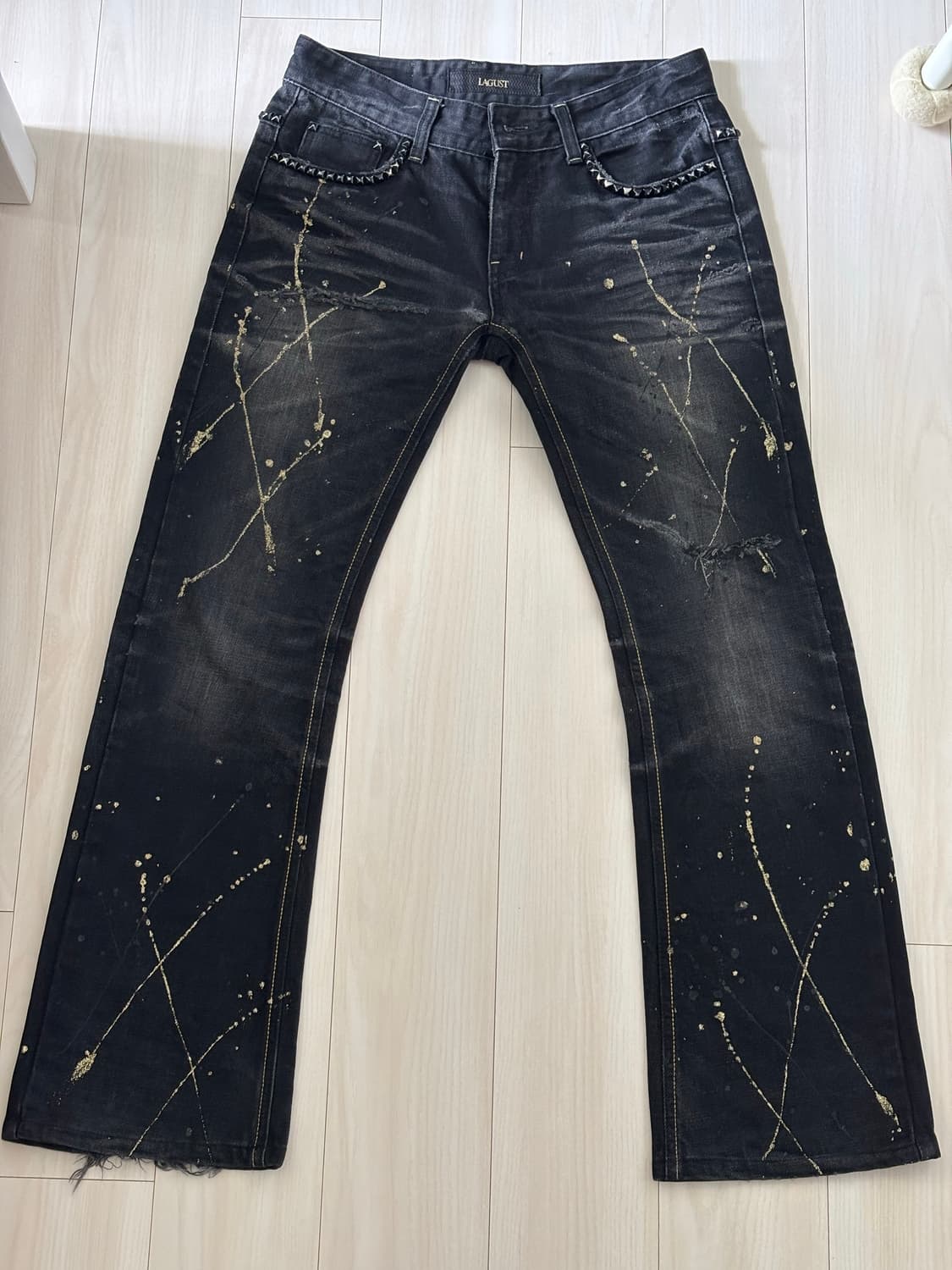 허단 37cm 총장 97cm 로우라이즈 세미부츠컷 흑청입니다 프린팅이 굉장히 독특해 소장가치가 있습니다 오염하자 없고 사용감도 적은 최상급 컨디션입니다 배송비 포함 가격 13만원입니다 문의 없으시면 안전 결제 부탁드립니다