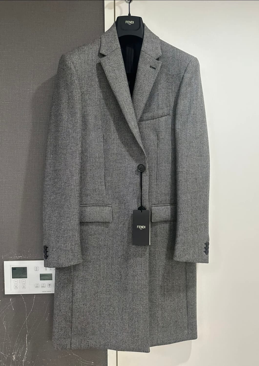 펜디 남성 코트 CAPOTTO DOUBLE MICRO PIED DE 모델 그레이컬러(하운드투스 패턴) 사이즈는 48 펜디 수트 케이스에 보관 중입니다. 신세계 강남점에서 구입 했습니다. 실측, 가슴 52cm(단면), 어깨 44cm, 소매기장 63cm, 총장 99cm