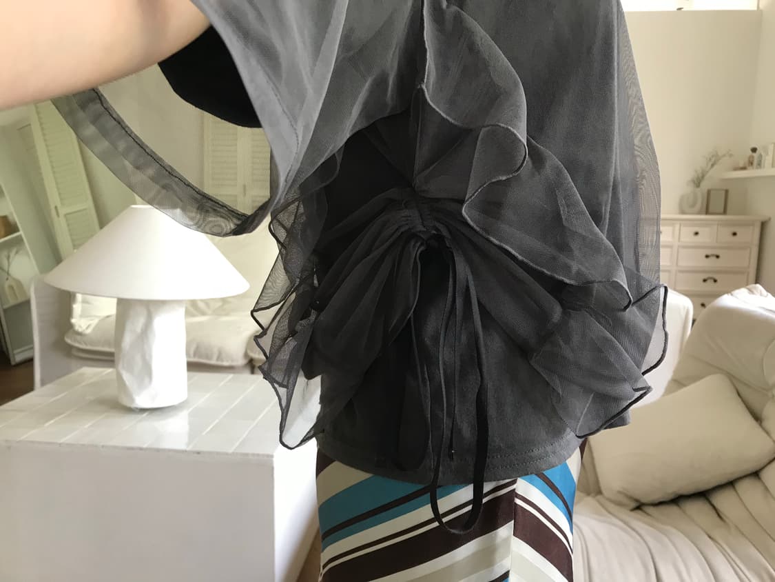 사이드 라인을 따라 스트링 디테일과 러플이 더해져 은은하게 퍼지는 실루엣이 포인트입니다.