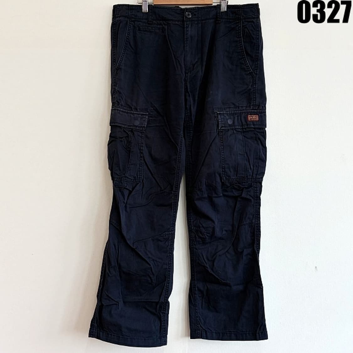 허리단면46 허벅지단면 31 밑단 24 총장 103.5 딥 네이비 컬러 베이스에 양쪽 카고 포켓이 적용된 전형적인 워크웨어 스타일의 제품입니다. 실용적인 포켓 구성과 견고한 디자인으로 스트릿 및 캐주얼 스타일링에 활용도가 높은 아이템입니다. 100% 코튼 소재로 제작되어 내구성이 뛰어나며, 디키즈 특유의 탄탄한 원단감이 특징입니다. 무릎 아래까지 이어지는 카고 포켓과 여유 있는 스트레이트 핏으로 활동성이 좋고 편안한 착용감을 제공합니다. 허리 양쪽에 사이즈 조절 벨트 디테일이 있어 실착 시 핏 조절이 가능한 구조입니다. 내부 택 확인 시 Dickies 정식 라벨, RN 넘버 및 제품 코드, 생산국 표기 등이 정상적으로 기재되어 있으며, 택 구성과 디테일을 종합했을 때 정품으로 판단됩니다. 사이즈는 34X32 표기이며 국내 기준 약 34 사이즈로 적당한 여유핏입니다.