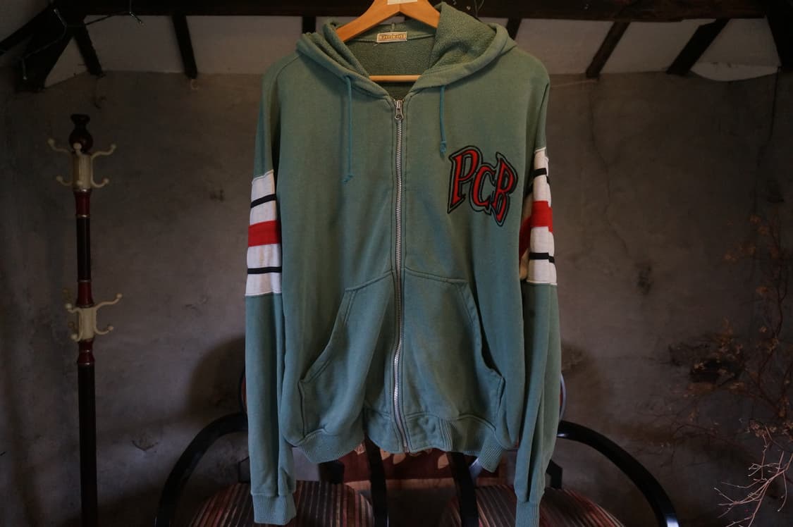 PAZZO CLUB hood zip-up 빈티지한 그린 컬러 베이스에 소매 라인 배색 디테일로 포인트 확실한 개체 전면 PCB 로고와 후면 PAZZO CLUB 아치 프린팅까지 앞뒤 밸런스 좋게 떨어집니다. 적당히 여유 있는 핏으로 가볍게 걸치기 좋은 타입