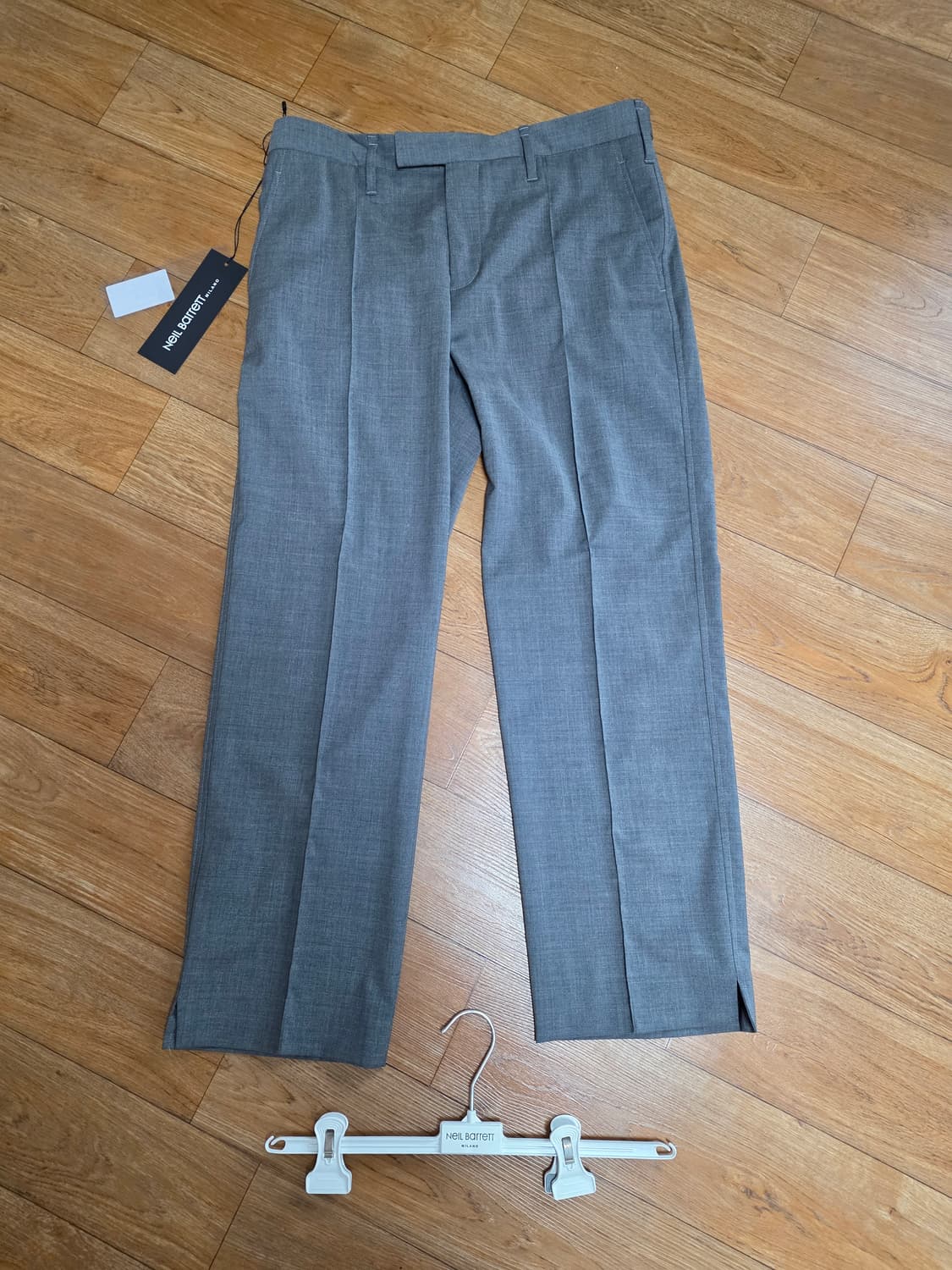 국내매장 새상품으로 리테일가 100만원 정도의 울 블렌드 스트레이트 기본 팬츠입니다.정품 옷걸이 포함 50 사이즈로 입으시는 스타일에 따라 32에서 34인치 정도 착용 가능합니다.구김없이 쫙 떨어지는 원단으로 밑단은 옆트임 처리 되어 스타일리쉬 합니다.살이 늘어 정리차 저렴하게 판매합니다.