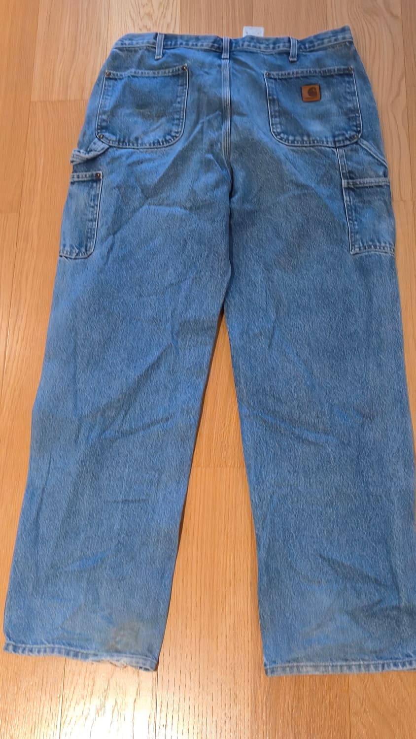 칼하트 정품 카펜터 데님 팬츠예요 38x34 가단 48cm 기장 113cm 덩치 좋으신 분들이 입어도 되고 오버핏으로 벨트차고 곱창지게 입어도 괜찮습니다. 워낙 유명한 제품 밑단 헤짐 빈티지 특유의 오염감있을 수 있으며 그것 자체가 멋인 옷이라 이해도 있으신 분만 구매해주세요. 빈티지 특성상 환불불가입니다.