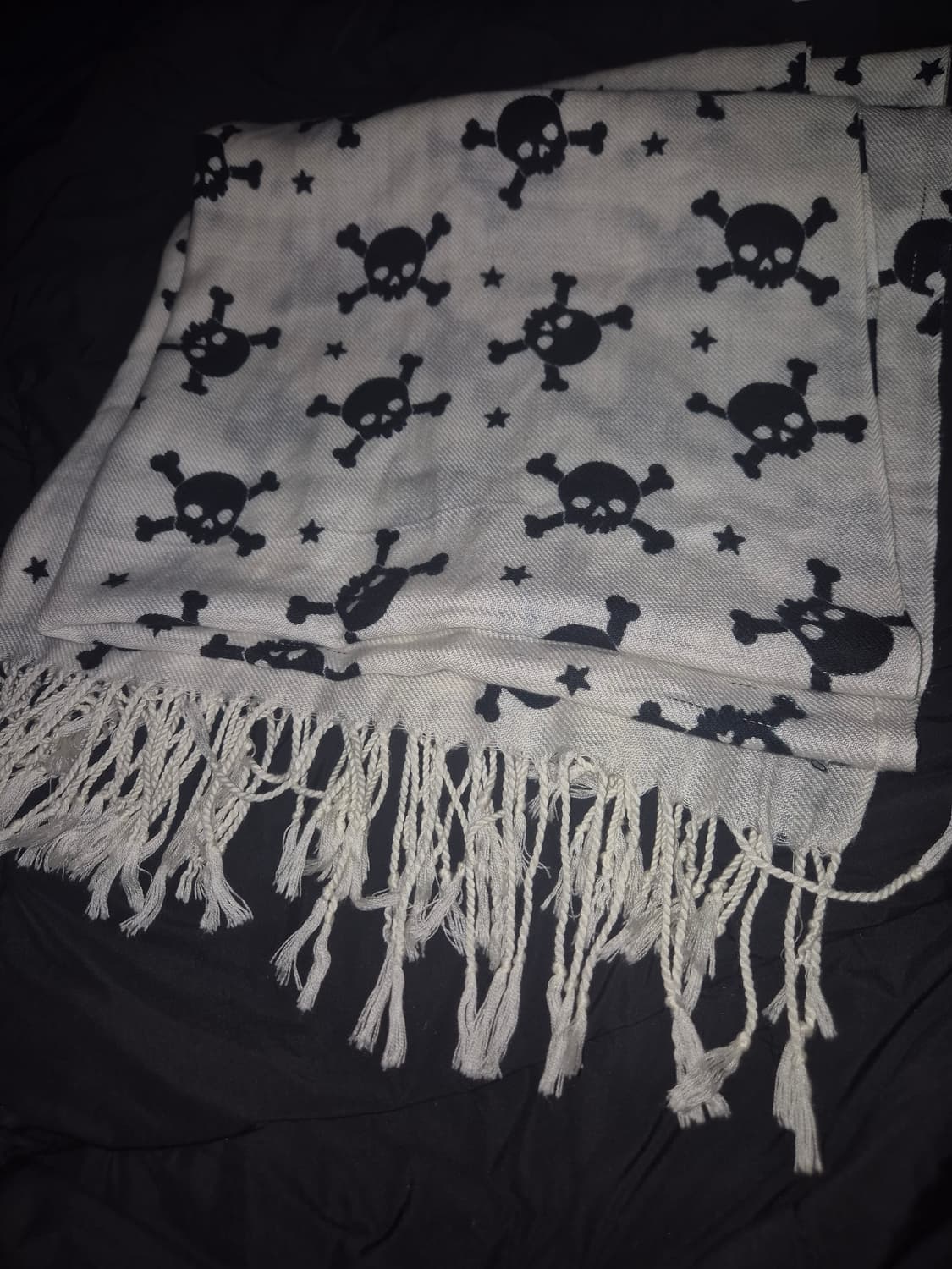 해골 별 쫑쫑쫑 박혀있는 머플러 👻부드러운 착용감에 편하게 맬 수 있습니당 🎆하얀색 바탕에 검정으로 별이랑 해골이 쫑쫑쫑 💖총장, 너비 둘다 널널하여 다양하게 연출하기 좋아용 💌펑크 느낌, 락시크 느낌 등 개성있는 포인트로 이용가능 💬총장 174 너비 72 / cm기준 실측 오차범위 존재 💫눈에 띄는 이염 및 하자 없으나 예민하신분들은 피해주세요 👾중고제품 사용감 등의 이유로 환불 및 반품 X 편의점 반값택배로 보내드려요 / 일반택배시 +1,500