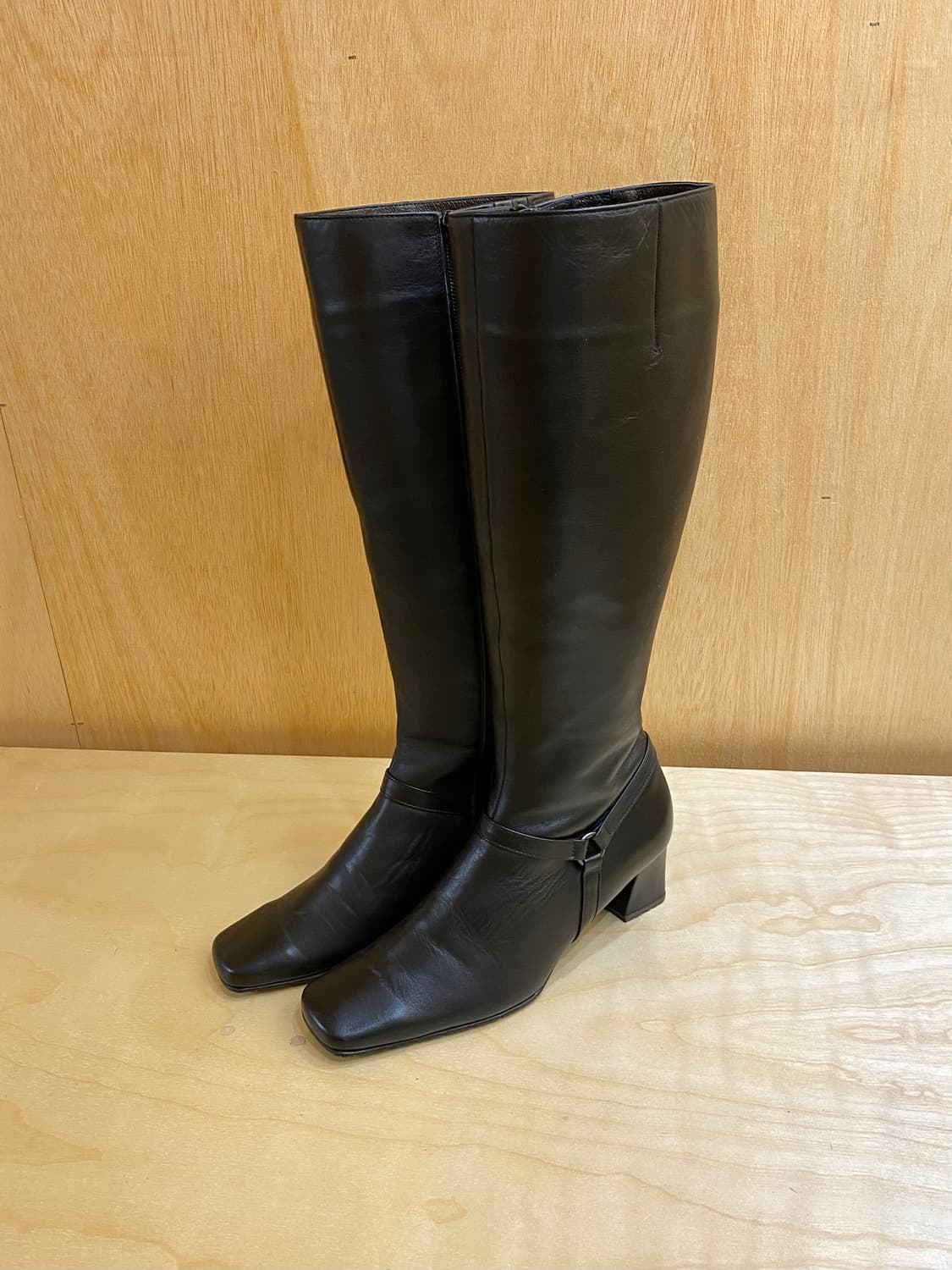 INFORMATION DETAIL - 일본 빈티지로 입고된 제품 (JAPAN MADE) - 총길이 44cm로 무릎에 가깝게 목이 높은 부츠 실루엣 - 스퀘어 쉐입의 각진 토와 구두굽 디테일, 하네스 디테일이 특징 CONDITION - 9.5/10 SIZE - 표기사이즈 235