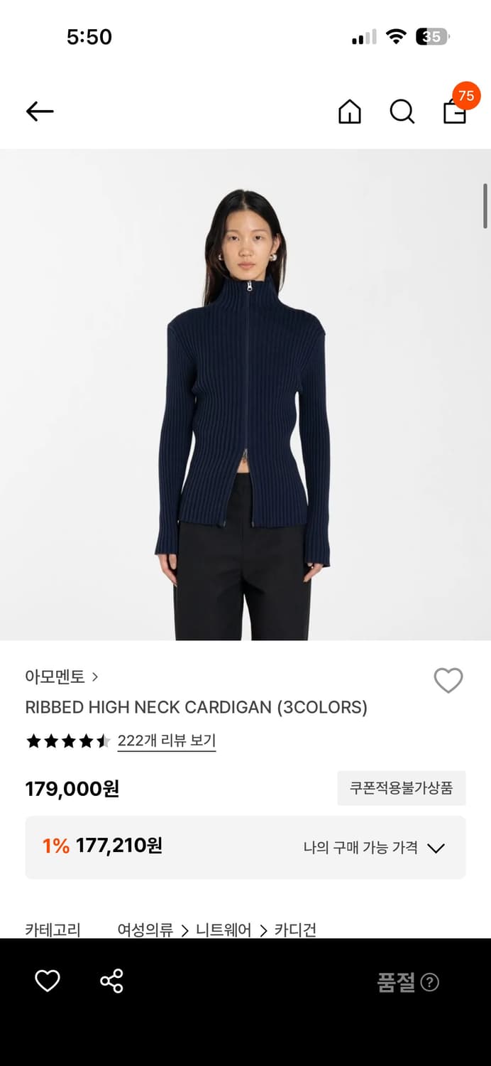 아모멘토 ribbed high neck cardigan black 한번 착용 후 보관중입니다 현재 품절이에요 정가 179000