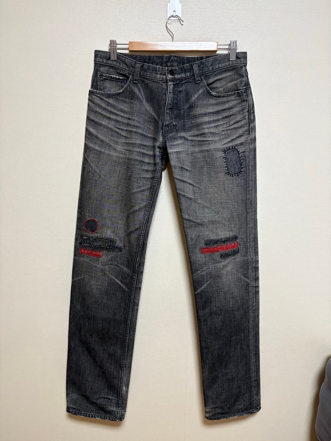 다크한 로멘틱 밤거리 방황하는 청춘같은 미야시타 시즌중 전환점이 들어가는 쇼중 하나인 05ss 피스중 하나입니다 06시즌들로 넘어가 명작들을 뽑아낼수있게 만들어준 발판같은 느낌이기도 합니다 어둡고 더 퇴폐적으로요 무릎부분에는 erd에서 보여주려고 하는 디테일들이 들어가있고 오묘한 회색컬러감에 레드실 조합이 너무 아름답네요 스키니한 실루엣이 오면서 넘버나인 금액도 정말많이 올라가고 있는데 훨씬 여유롭습니다 해외 시세 반영하여 금액측정 하였습니다 허리40 허벅지 28 총장107 밑단끌림있음