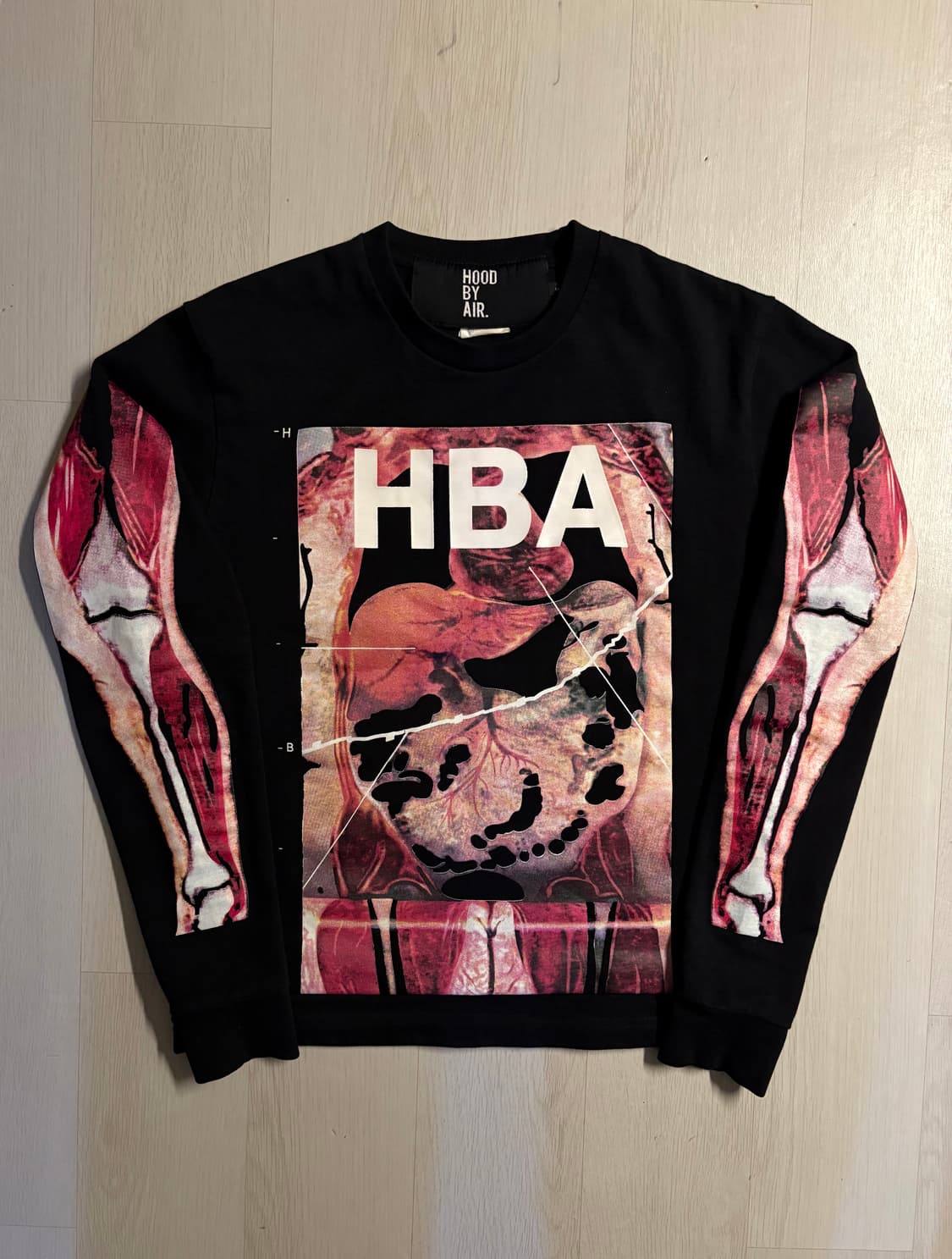 Hood By Air 14AW 시즌 ‘ORGAN & BONES’ 그래픽 롱슬리브입니다 전면 HBA 로고와 함께 해부학적 모티브 그래픽이 들어간 제품으로 슬리브까지 이어지는 풀 프린팅 디테일이 특징입니다 요즘 HBA 라인과는 다른 초기 아카이브 특유의 강한 무드가 있는 제품입니다 상태: 전반적으로 양호 프린팅 컨디션 좋음 밑단 수선 있음 (착용 시 큰 이질감 없음) 국내 정식 수입 제품이며 넥라벨 / 케어라벨 모두 확인 가능합니다 단순변심 교환,환불 불가