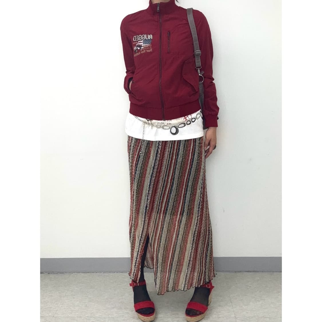 brand - fabric(%) - size(cm) 허리32~55 총장93 - 레드 톤의 컬러풀한 사선 스트라이프 패턴과 밑단 슬릿 디자인이 매력적인 플리츠 스커트 - 프릴 밑단 디자인 - 허리 전체 밴딩으로 편안한 착용감 - 미디 기장의 안감 model 170cm 55size / 5만 원 이상 구매 시 무료배송