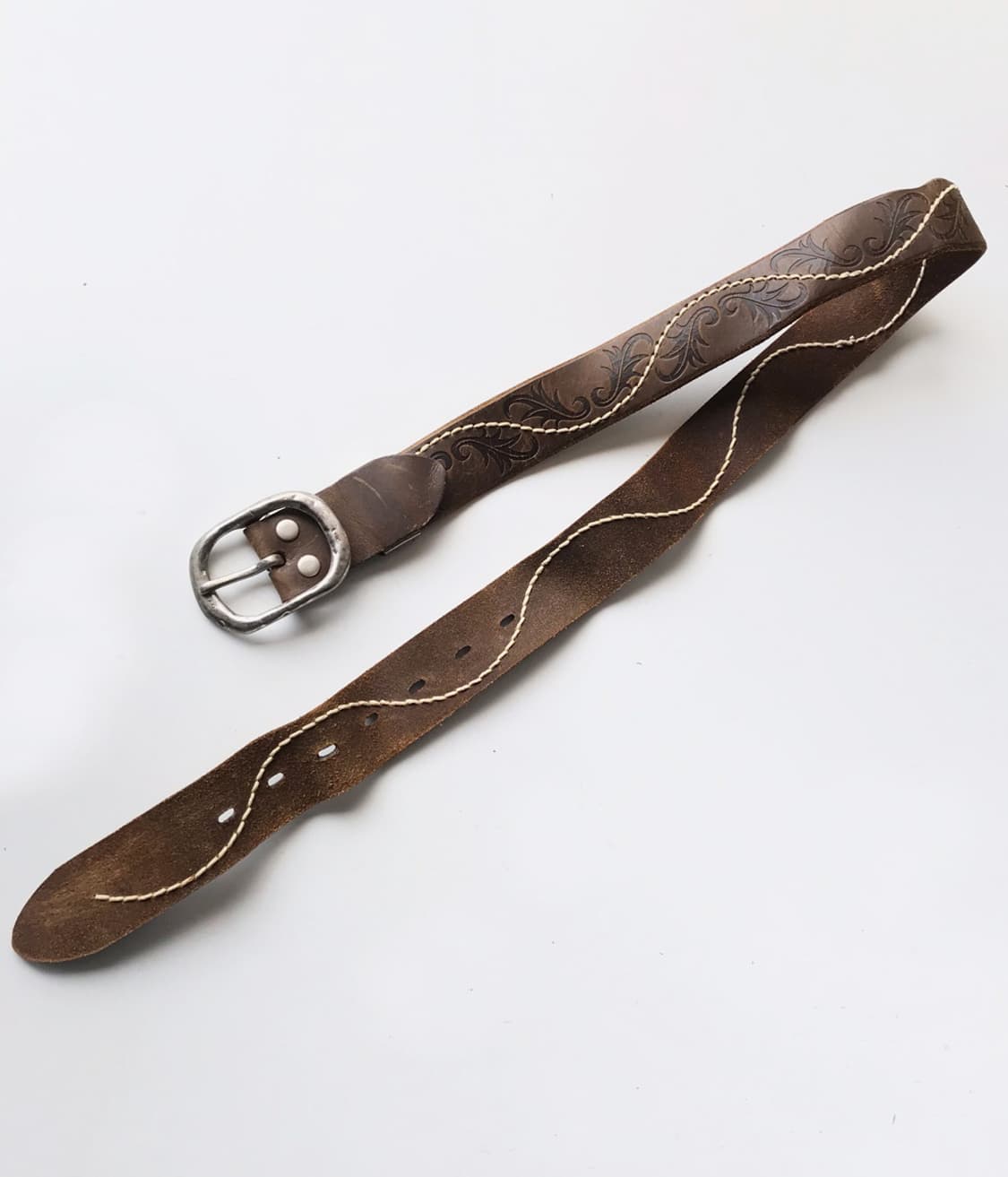 Japan vintage western leather belt color : wood brown size : 28-34인치 버클 - 가로 7 세로 5.3 벨트 - 폭 4 길이 100 (버클 제외) - 전반적 사용감 존재하나 준수한 컨디션 - 빈티지 무드가 있는 우드 브라운 컬러 - 두께감이 있으면서도 부드러운 가죽 소재를 사용 - 웨스턴 풍의 음각 패턴과 화이트 스티치 포인트