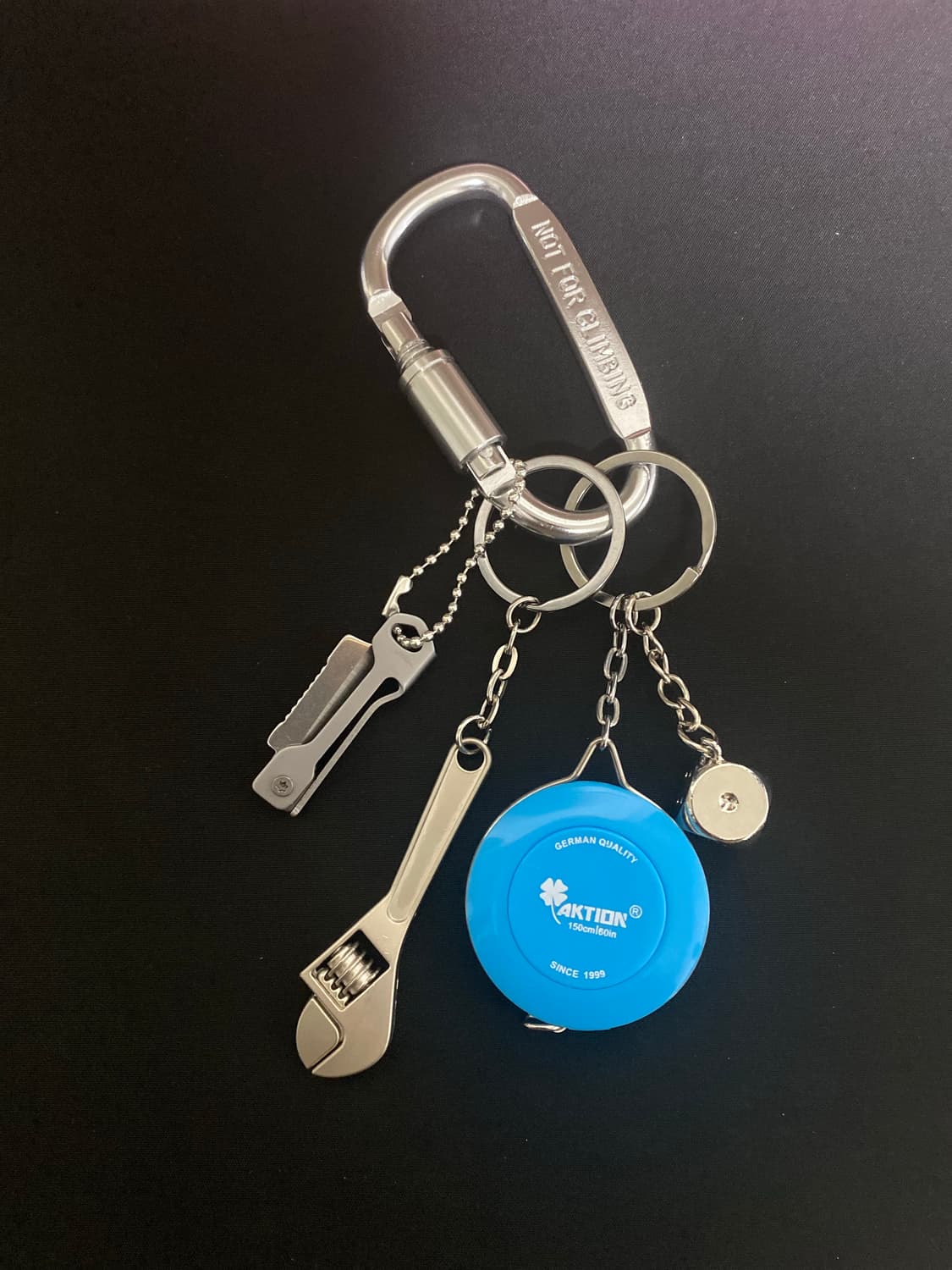 유틸리티 감성을 살린 멀티툴 키링입니다. 실버톤 알루미늄 합금 대형 카라비너에 실사용 가능한 줄자, 미니 스페너 ㆍ미니 나이프 파츠와 묵직한 메탈 다이스를 조합해 단순 장식이 아닌 기능성과 스타일을 동시에 잡은 인더스트리얼 무드 키링입니다.