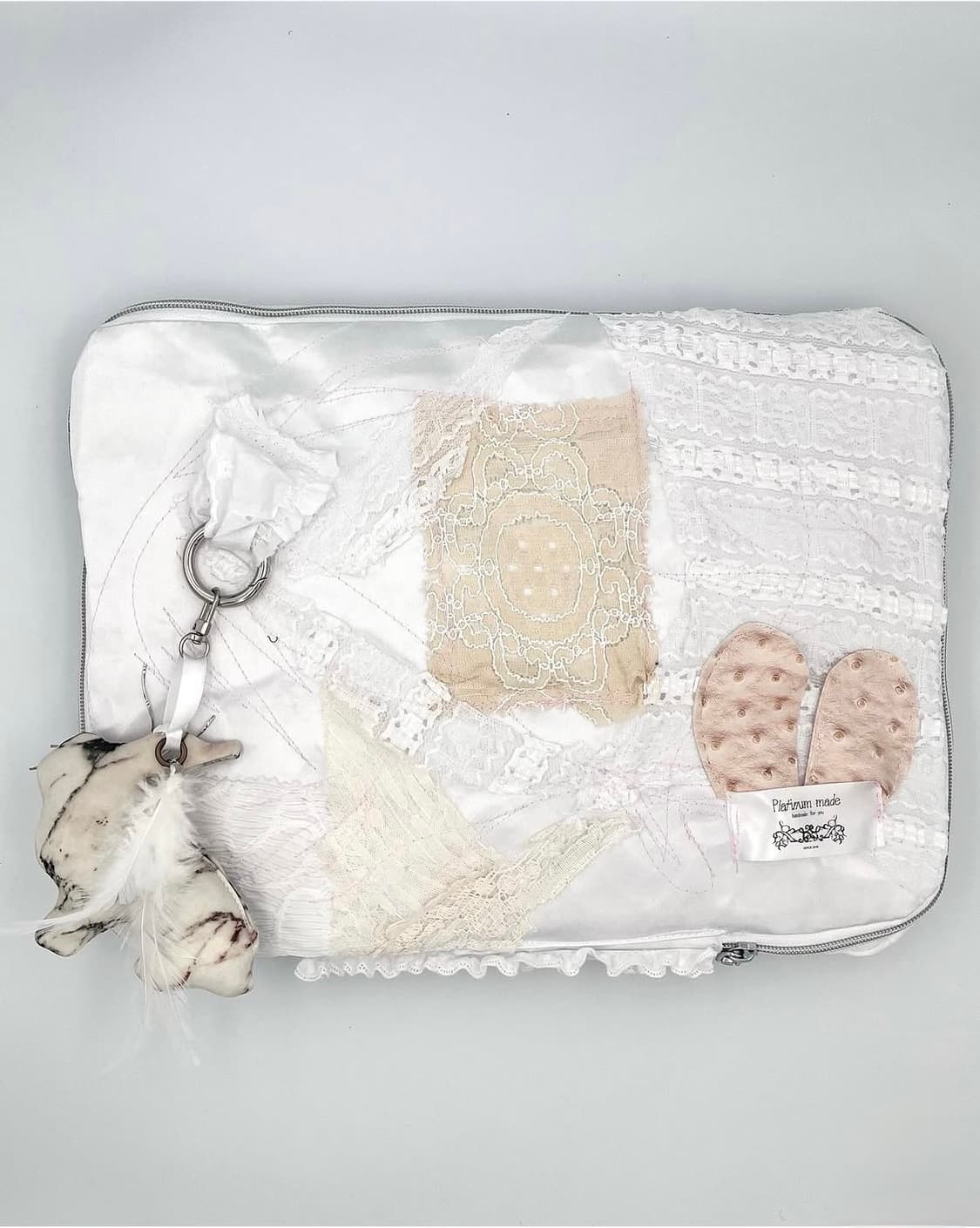 Rabbit Laptop pouch 부드러운 텍스쳐를 지닌 퀄팅소재로 노트북을 안전하게 수납할 수 있어요. 다양한 패브릭과 자수, 레이스 등을 사용하여 정성껏 제작되었습니다. *키링 미포함 / one and only 28*38cm