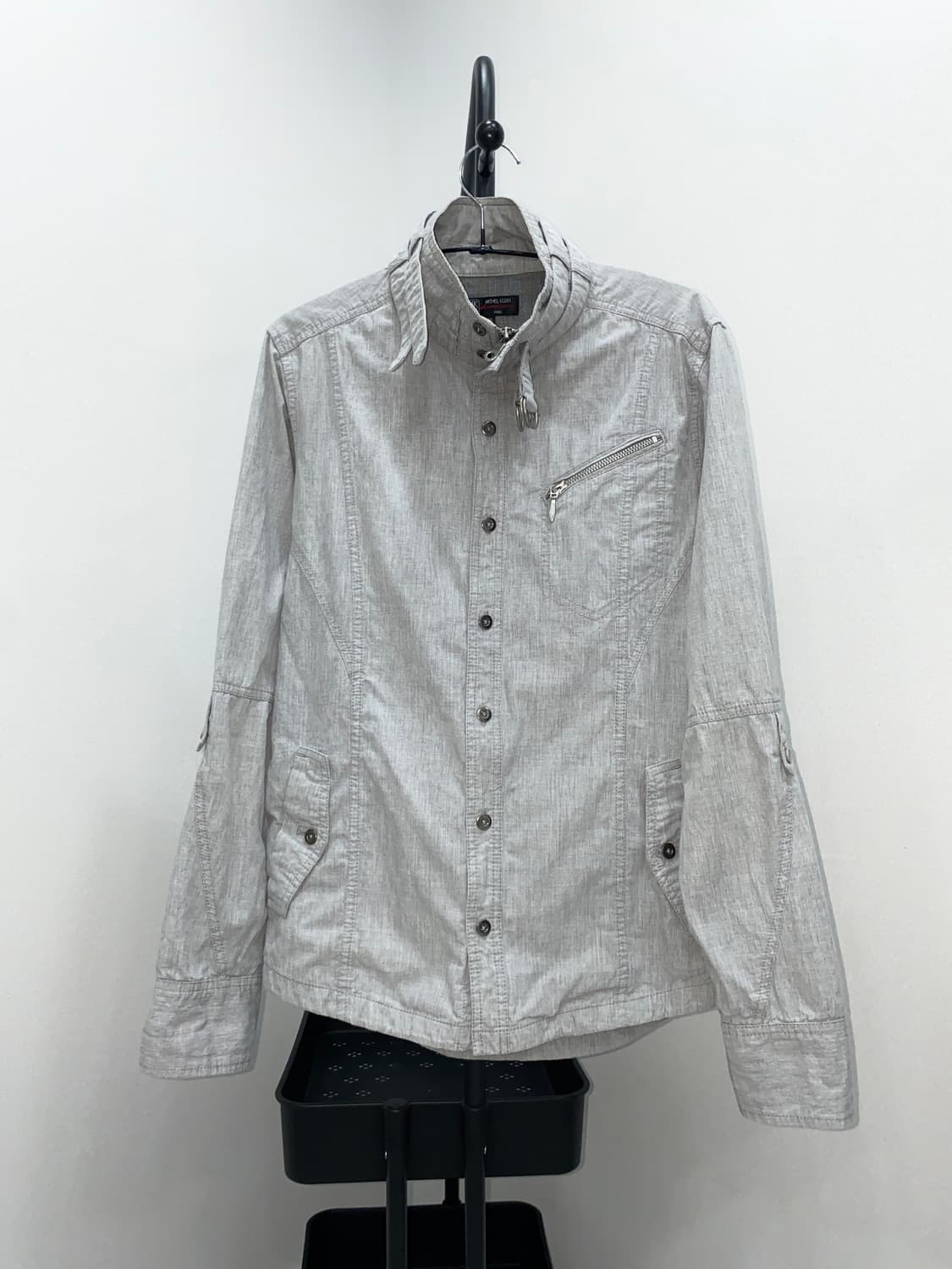 High-Neck Utility Field Jacket 미쉘 클랑 사의 옴므 라인 필트 자켓입니다. 넥 라인의 비대칭 지퍼와 버클 스트랩을 통해 카라를 세우거나 눕혀 다양한 연출이 가능하며, 비대칭 가슴 지퍼 포켓과 소매의 롤업 버튼 등 실용적인 디테일이 포인트인 제품입니다.