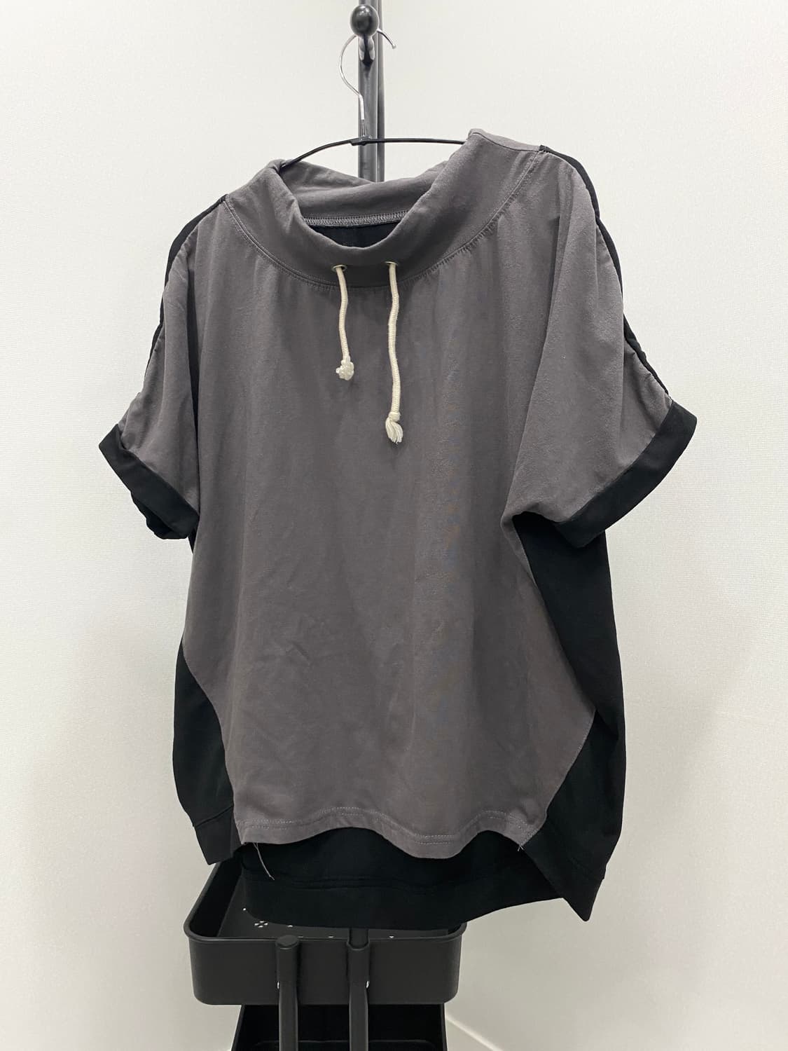 Cowl-Neck Top 넥부분이 자연스럽게 흘러내리는 카울 넥 형태에 로프 형태의 드로우스트링이 추가되어 스포티하면서도 아방가르드한 느낌을 줍니다. 앞면과 옆면이 배색이며 가오핏으로 연출 됩니다. Size S 어깨R 가슴66 소매28 총장63 단면(cm)