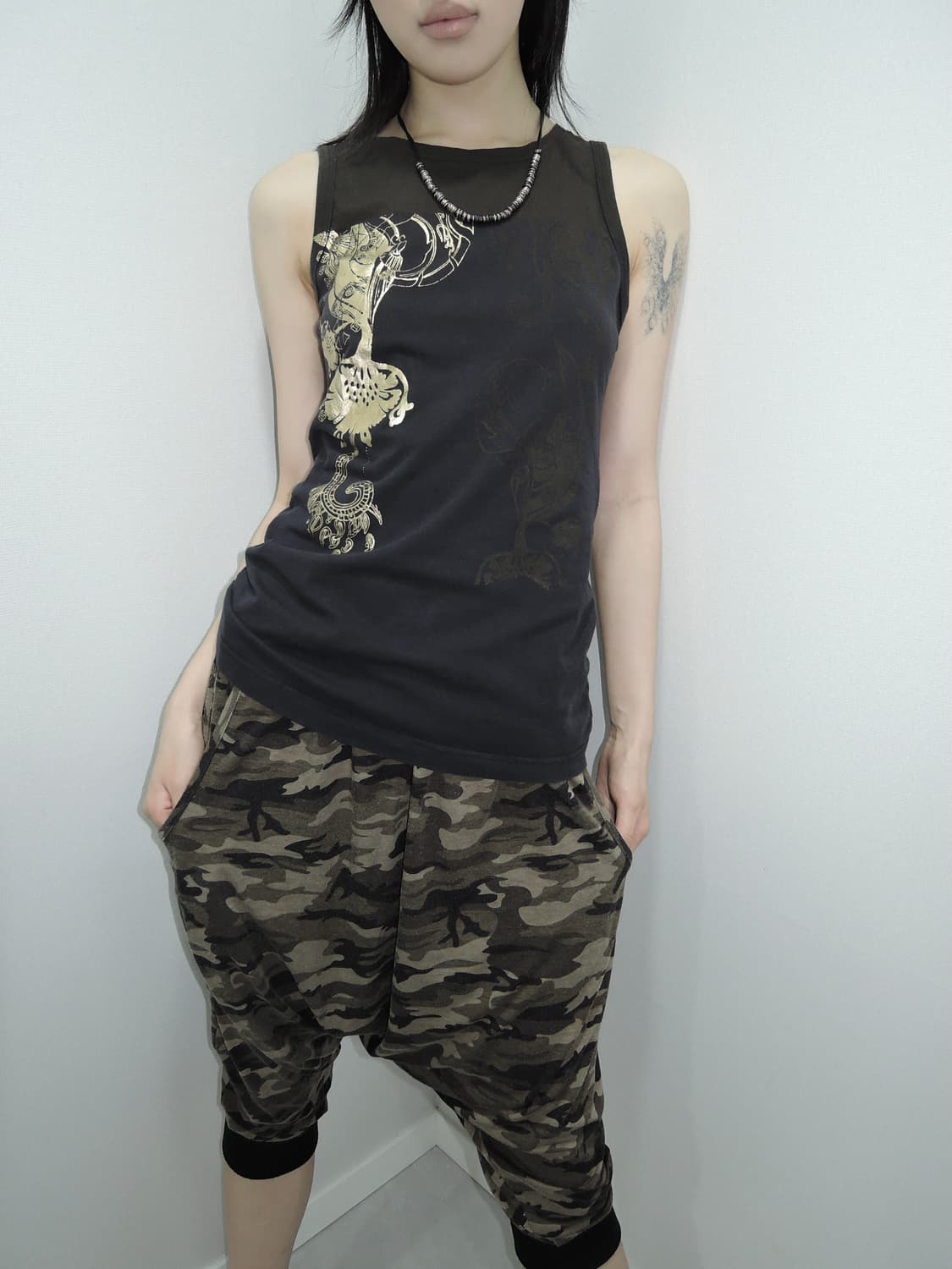 Gold Foil Tribal Graphic Sleeveless 디젤 사의 그래픽 슬리브리스 입니다. 트라이벌과 기하학적 패턴의 골드 포일 프린팅이 포인트인 제품입니다.