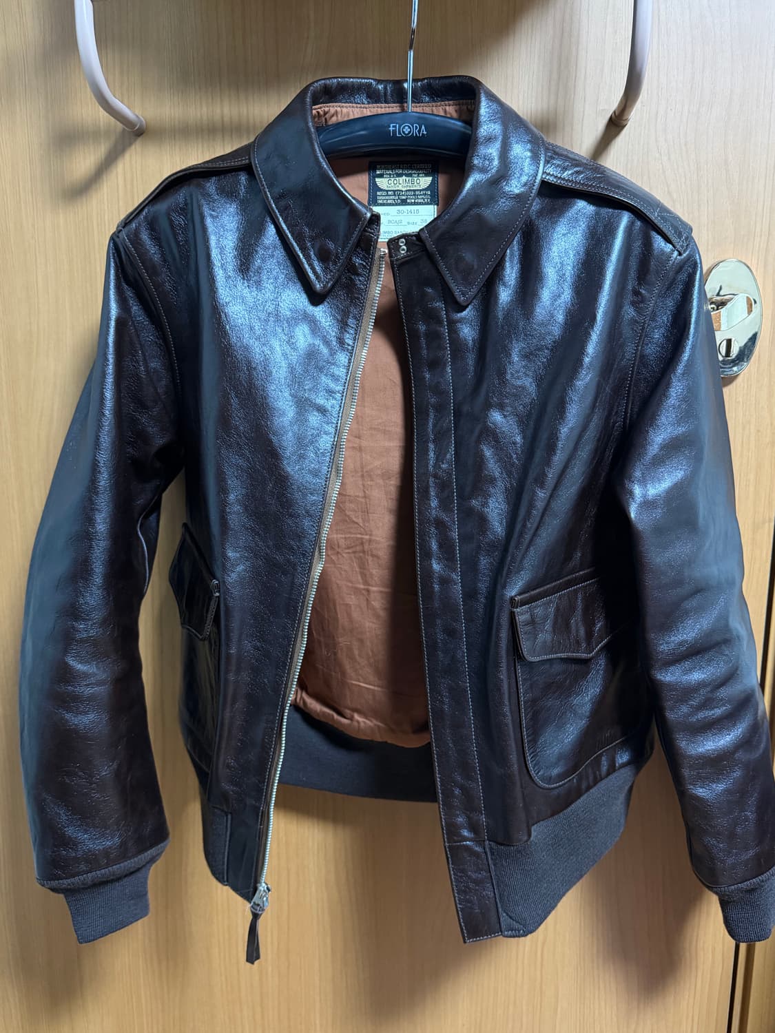콜림보 A-2 자켓(ZX-0155 AAF Flying Aces Leather Jacket) 38사이즈 실 브라운(Seal brown)컬러입니다. 시착했을 때 생긴 약간의 팔주름 외엔 구매한 그대로 새상품입니다. 사이즈 미스로 판매합니다. 국내 편집샵에서 2,580,000원에 판매되었던 제품입니다. 고가 제품이니만큼 직거래 선호합니다. 직거래는 강서구, 마포구(홍대 인근), 고양시 가능합니다. 실측 사이즈 어깨 45, 가슴 52, 팔 54, 총장 61