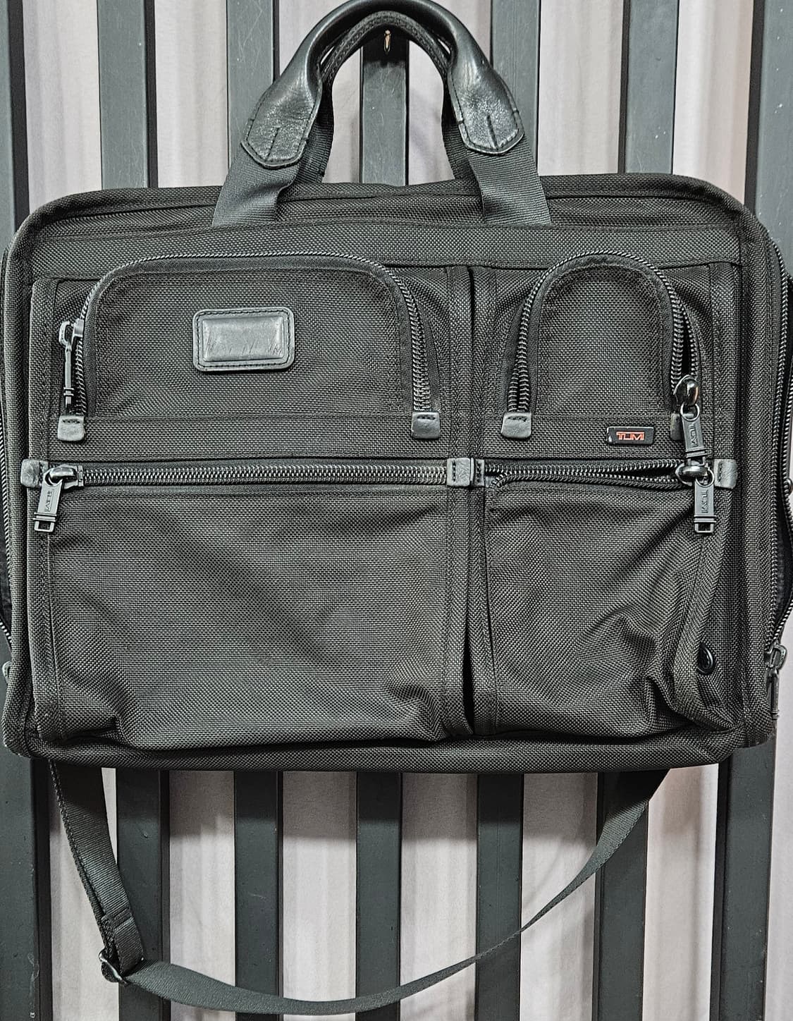 투미 특유의 내구성이 뛰어난 FXT 방탄 나일론(Ballistic Nylon) 소재와 가죽 트리밍으로 제작되었습니다. 최대 17인치 노트북을 수납할 수 있는 전용 패딩 컴파트먼트가 있으며, 서류 및 IT 기기 액세서리를 정리할 수 있는 다수의 지퍼 포켓과 오거나이저가 포함되어 있습니다. 가방 뒷면에는 캐리어 핸들에 끼울 수 있는 애드 어 백(Add-a-Bag) 슬리브가 있어 출장 시 편리합니다. 전체적으로 상태 양호하고 어께패드가 없습니다. 가로43 세로31