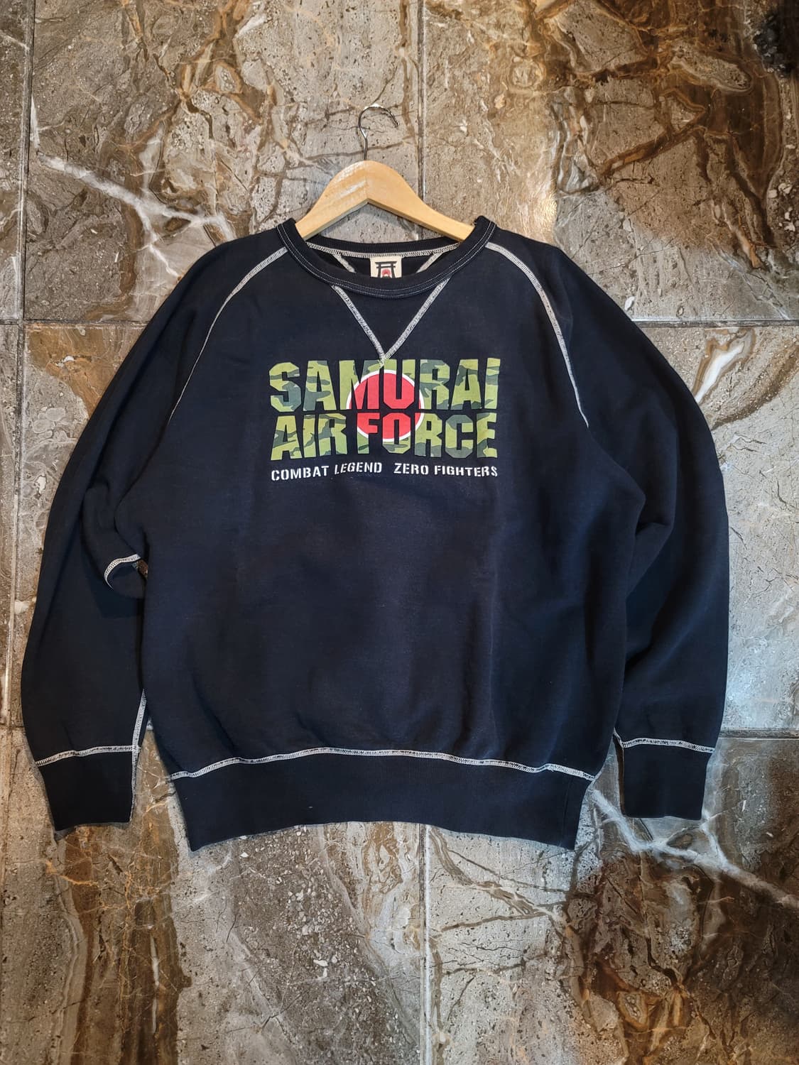 사무라이진 맨투맨입니다. 가슴팍에 사무라이 에어포스 프린팅이 매력적이네요. 넉넉한 사이즈감으로 편하게 입으실 수 있습니다. 문의 없으시면 바로 안전결제해주시면 됩니다! 사이즈 실측사진 참고하세용