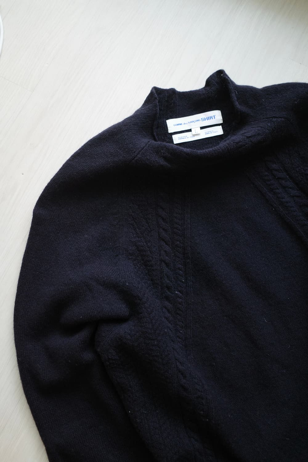 Comme des Garcons SHIRT Made in ITALY high neck knit 사이즈:L 귀한 꼼데 L사이즈 레글런에서 허리따라 케이블 디테일이 무심하게 멋있어요. 여성분이 원피스 느낌으로 착용해도 좋습니다. (엉덩이 다 덮는 기장) 여성 착샷유