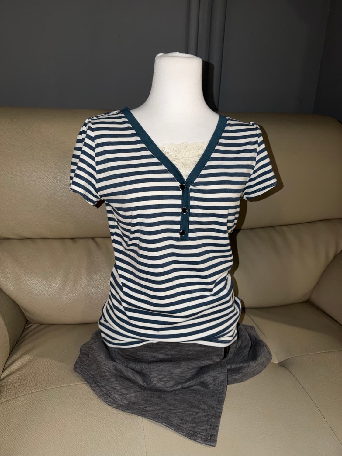 •lace layered button-up stripe top •size: cm 36 44 56(어깨 가슴 총장) •price: 38000 -레이스 레이어드 디자인이 매력적인 스트라이프 탑 -제가 너무 살앙하는 버튼업 디자인으로 브이넥으로 떨어지는 라인감까지 아주 매력적인 제품이랍니다! -핏감두 넘 예쁘고 ..요건 너무 강추요 !!! -안감 미세 보풀감