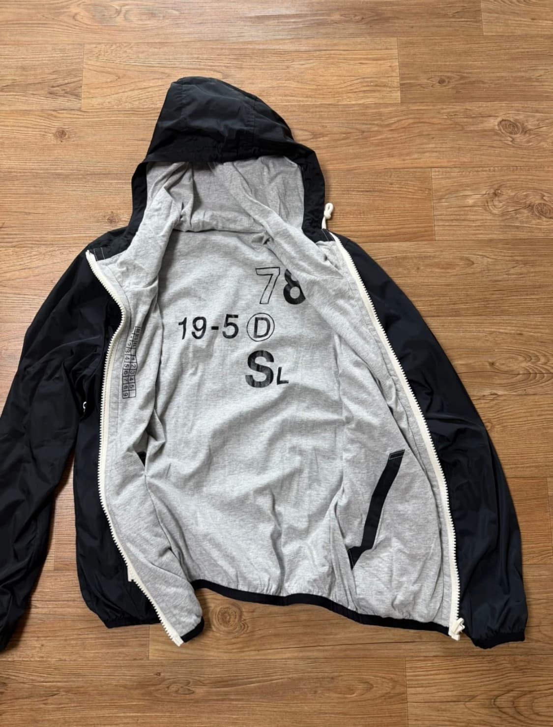 양면자켓이고 한쪽면은 바람막이 및 방수 기능있고 다른 면은 부드러운 감의 면 감촉입니다. 후드가 달려 있어 활동성을 더해주며, 지퍼 디테일이 포인트입니다 안감에 19-5 D SL 등의 프린팅이 있어 독특한 느낌을 주고 예쁩니다. 간절기에 가볍게 걸치기 좋고 상태 좋아요.