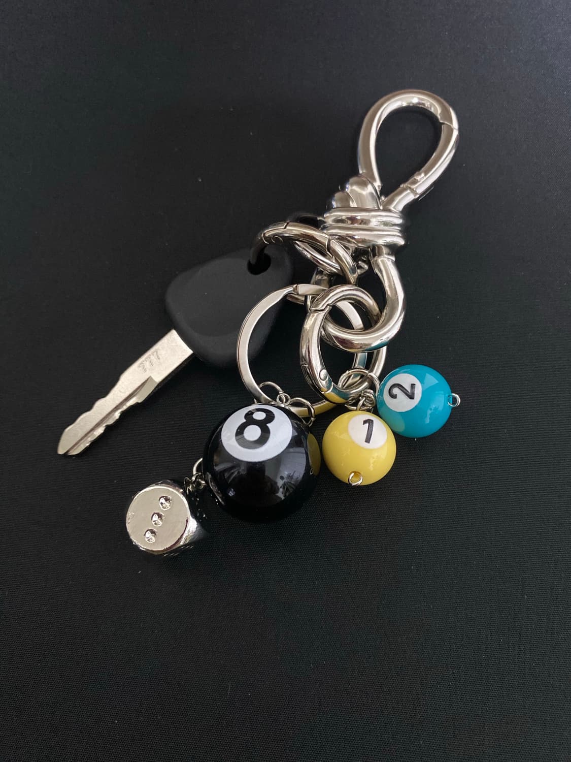 금속 트위스트 매듭 모먕의 카라비너에 8볼ㆍ컬러 넘버 볼ㆍ메탈 다이스 참을 믹스한 유니크 키링입니다. 묵직한 실버톤 베이스에 빌리어드 볼을 더해 포인트를 준 디자인입니다 가방, 팬츠 벨트고리, 키홀더 어디에나 포인트로 연출하기 좋은 아이템으로 리본모양의 카라비너 단독으로도 존재감 있는 키체인입니다.