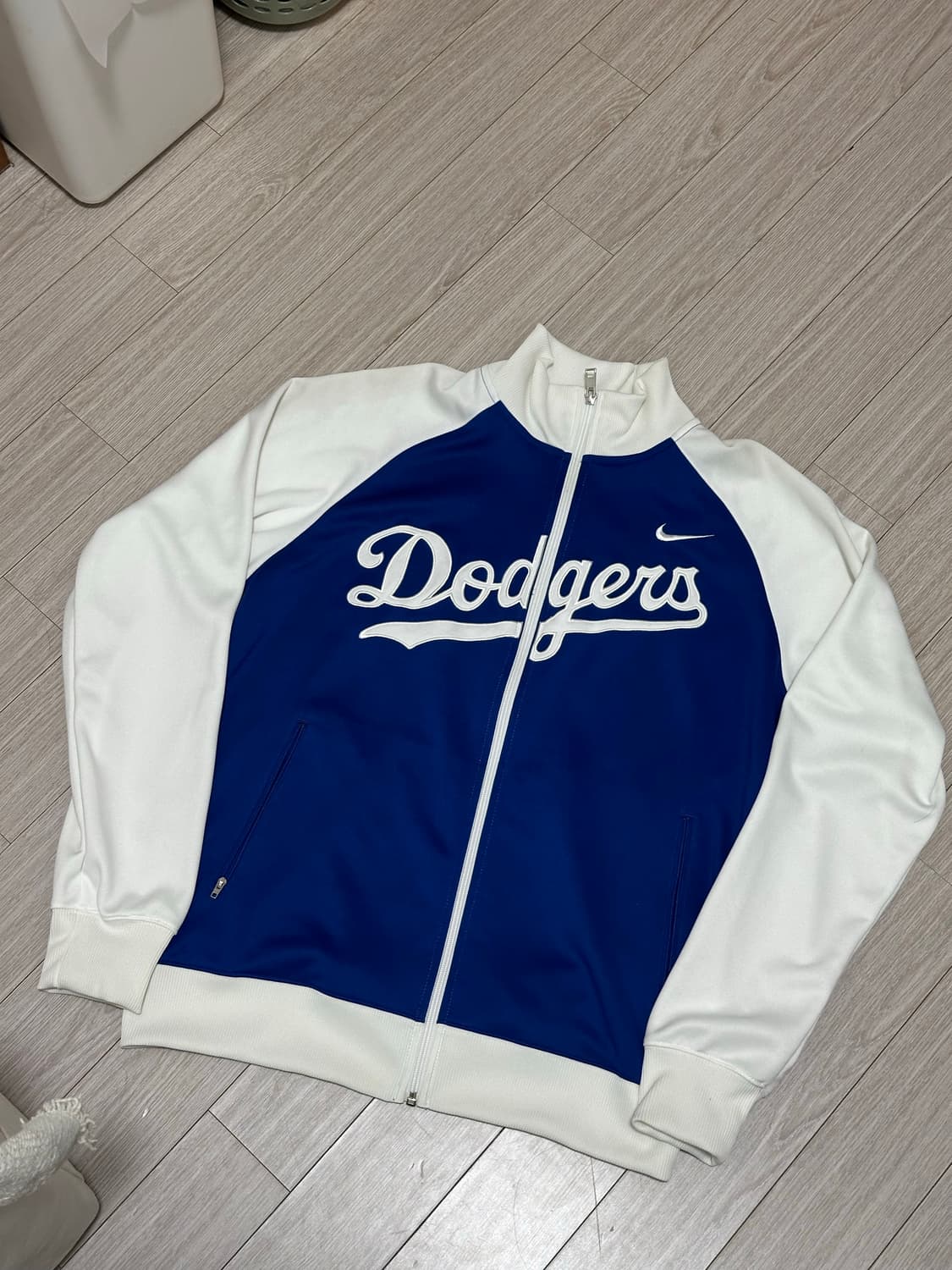 블루 & 화이트 컬러 조합이 매력적인 나이키 LA 다저스 트랙 자켓입니다. 가슴팍에 LA 다저스 로고가 크게 박혀있어 포인트로 좋습니다. 트레이닝이나 가벼운 운동할 때 편하게 입기 좋아요. 가슴단면 56 깃제외 기장 64