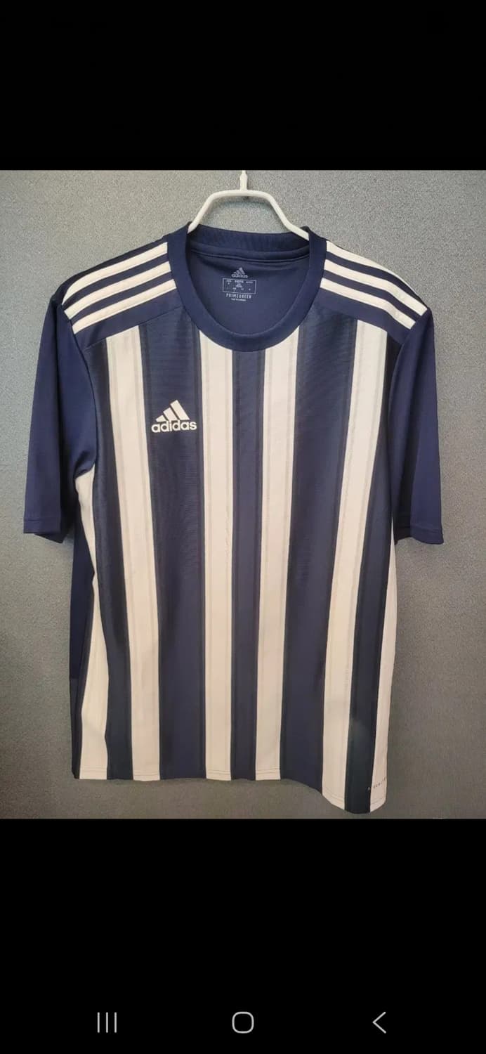 아디다스 축구반팔티에요. 새상품이구요. 사이즈 L, 가슴단면 48, 총장 72, 95-100까지 맞으실것같아요. 100사이즈는 타이트해요. 색상 진네이비에 흰색이요.