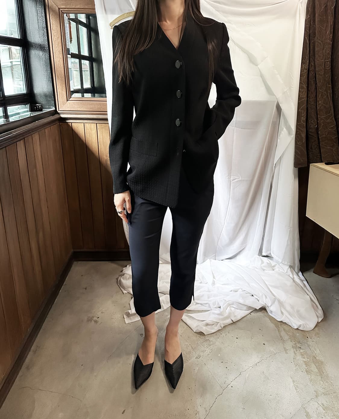 PRODUCT INFO - 아세테이트 65% 레이온 35% - 블랙 컬러에 은은한 자카드 텍스처가 더해진 클래식 자켓 - 깊지 않게 떨어지는 브이 쉐입 숄카라 라인으로 단정한 실루엣 - 프론트 버튼 클로징과 양쪽 플랩 포켓 디테일 - 소매 3버튼 디테일로 마무리된 포멀한 무드 - 내부 어깨 패드 SIZE INFO - 표기사이즈 12 - 어깨 39cm - 가슴 49cm - 소매 59cm - 총장 68cm MODEL INFO : JIYEON 164cm 55size, MINJI 166cm 66size EXCHANGE AND REFUND - 모든 제품은 정품만을 선별하여 바잉하고 있습니다. - 빈티지 제품은 USED 제품으로 교환 및 환불이 불가능합니다. - 민감하신 분들께서는 신중히 고민하신 이후 구매 부탁드립니다. - 사이즈 측정 방법과 위치에 따라 1~2cm의 오차가 있을 수 있습니다. - 해상도 및 밝기에 따른 색상 차이가 있을 수 있습니다. SHIPPING - 기본 배송료 3,500원이며, 산간도서지방은 별도의 추가 비용이 발생할 수 있습니다. - 택배 접수는 주문 일자 기준 익일에 처리 됩니다. (주말 제외) - 배송은 2~5일 정도 소요되며 거래처 사정에 따라 더 지연될 수 있습니다.
