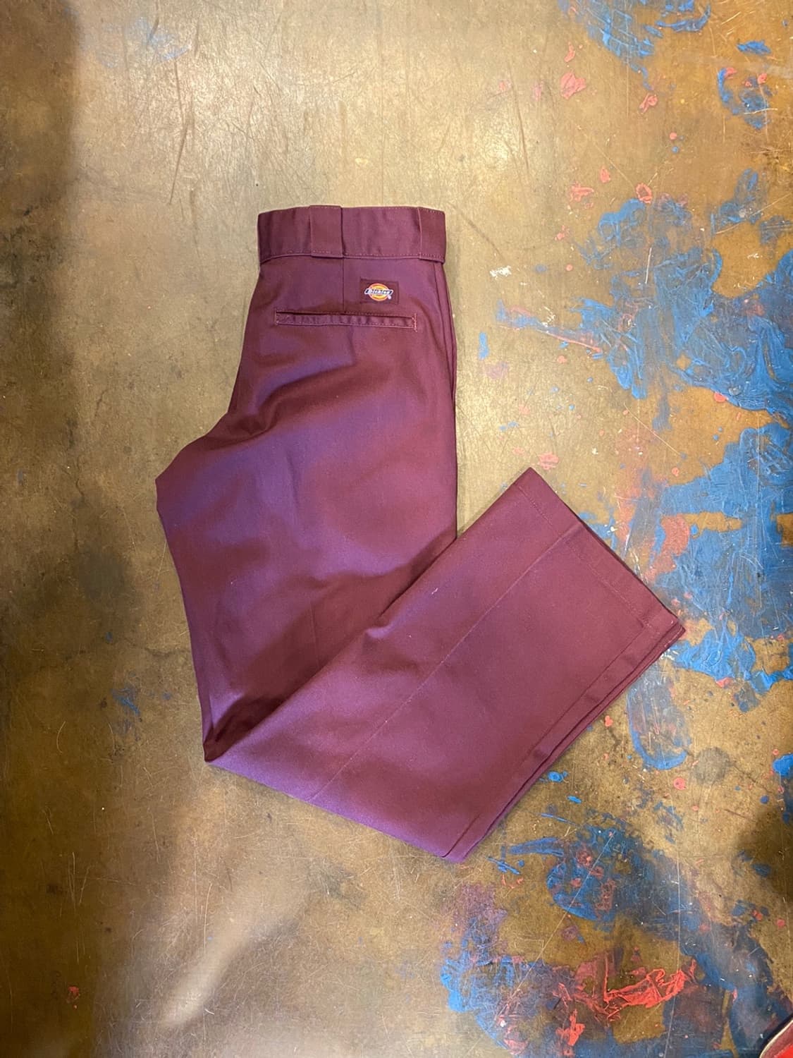 딕키즈 874의 코튼팬츠입니다. 와인계열의 색감과 빳빳한 코튼패브릭으로 연출된 제품으로 딕키즈 고유의 오리지널핏으로 아직까지도 많은 분들이 찾는 모델이죠. 신품급 컨디션이며 사이즈30 추천드려요. 허리40 밑위32.5 허벅지30 밑단22.5 총장97.5